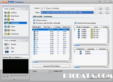 DVDFab یکی از آسانترین روش های ممکن برای کپی کردن فیلم های DVD می باشد. فقط کافیست فیلم DVD و یک DVD خالی را در درایو قرار داره و بر روی Start کلیک کنید. تمام محتویات فیلم DVD شامل Menu، Trailer و دیگر محتویات به سرعت و به طور خودکار بر روی DVD خالی کپی می شود. به وسیله این نرم افزار و تنها با یک یا دو مرحله قادر به کپی دیسک های DVD به DVDR، PSP، IPOD و … خواهید بود.