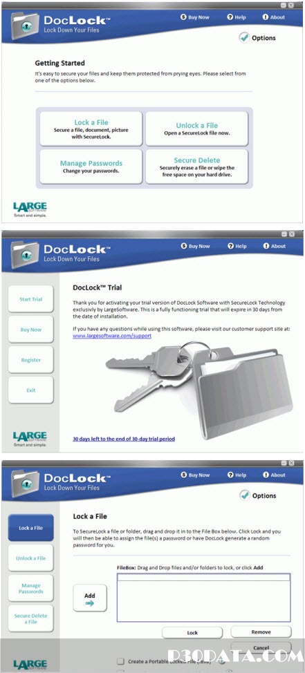 docLock یکی از قدرتمندترین و بهترین گزینه های موجود پیش روی شماست که با استفاده از آن می توانید به سادگی فایلها و یا فولدرهای مورد نظر خود را به وسیله ی پسورد محافظت کرده و احتمال دستیابی افراد غیر را به اطلاعات موجود در آنها به صفر برسانید . این نرم افزار با در اختیار داشتن یک اینترفیس کاربرپسند شما را از داشتن هرگونه مهارت نرم افزاری بی نیاز می سازد . با بهره گیری از فناوری Drag & Drop می توانید فایلهای مورد نظر خود با تنها کشیدن و رها کردن در محیط برنامه به صورت رمزگذاری شده در آورده و ایمن سازید .
