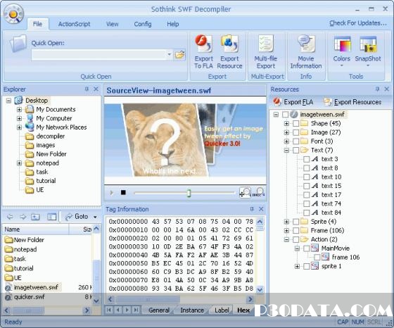 نرم افزار حرفه ای Sothink SWF Decompiler به ساده گی فایل های SWF/EXE را به فایل FLA و فایل تبدیل swf را به FLEX تبدیل کرده و تمامی اجزای داخلی آنها را استخراج میکند. این نرم افزار به طور کامل از نرم افزار swf 6, Flash MX 2004 (7.0), Flash 8, Flash CS3 (9.0) و Flash CS4 (10.0)و حتی FLEX پشتیبانی میکند و با ActionScript 2.0 و ActionScript 3.0 سازگاری دارد. برنامه فلش Sothink SWF Decompiler همچنین میتواند فایل های Flash ساخت فلش نصب شده به روی کامپیوتر را نیز اسکن کند.